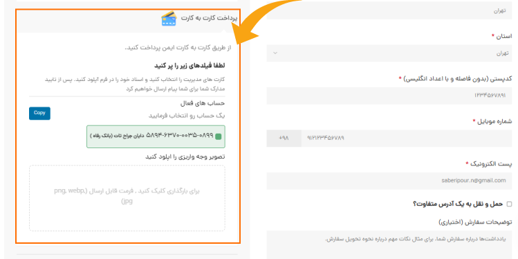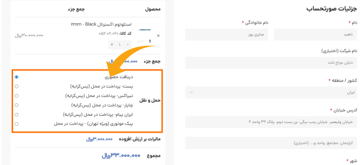 ۵. بعد از پر کردن فرم سمت راست، می توانید نحوه حمل و نقل مدنظرتان را انتخاب کنید.